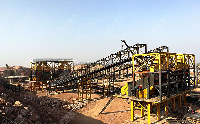 年產(chǎn)300萬噸煤矸石加工項(xiàng)目的篩分現(xiàn)場,使用了圓振動(dòng)篩對出料進(jìn)行篩選,篩分出不同規(guī)格的建筑石料。