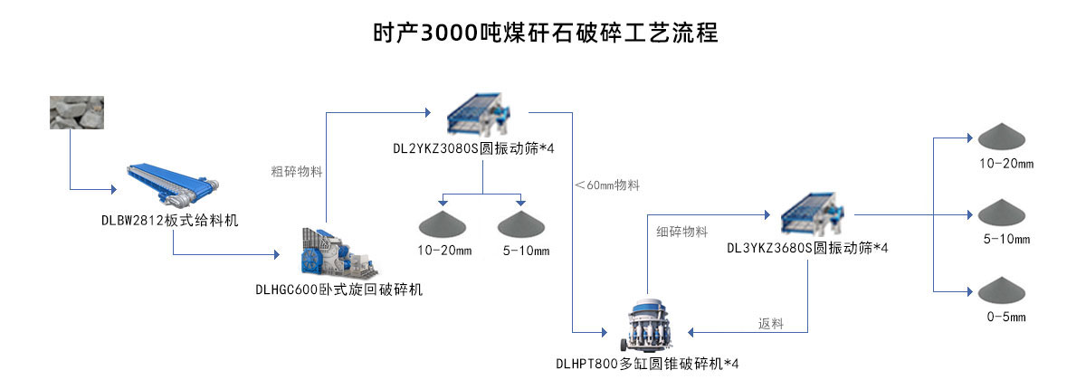 煤矸石是開采于洗煤過程中排除的固體廢料,可破碎后作為建筑材料使用。其破碎工藝流程是通過原料倉下方的板式給料機(jī)將之送入臥式旋回破碎機(jī)中進(jìn)行破碎整形,然后再進(jìn)入多臺(tái)沖擊破碎機(jī)進(jìn)行機(jī)制砂處理,出料通過圓振動(dòng)篩將之篩分成多種規(guī)格的建筑石料,使用皮帶機(jī)送入料倉中進(jìn)行存儲(chǔ),整個(gè)項(xiàng)目還需配置除塵器進(jìn)行揚(yáng)塵粉塵吸收。也可配置洗沙機(jī)進(jìn)行石料清洗。