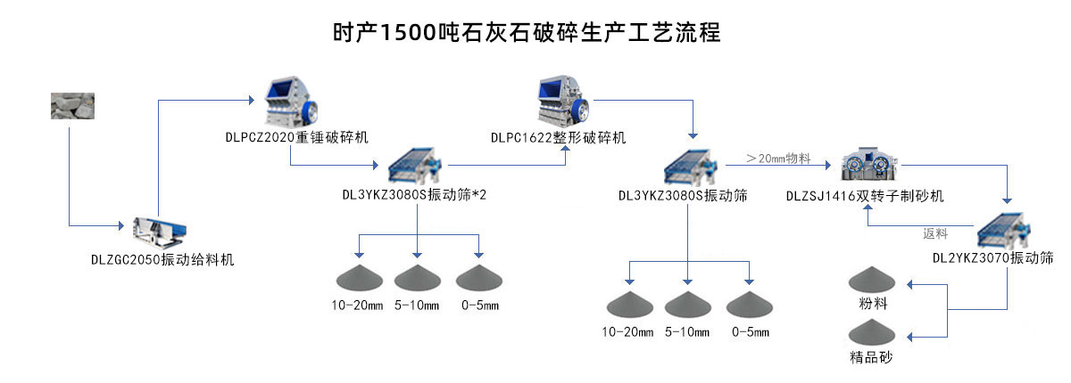 石灰石又叫灰?guī)r,硬度一般不大?墒褂靡淮纹扑檎蔚募庸すに,石灰石通過振動給料機均勻送入重錘破碎機進(jìn)行破碎,出料通過圓振動篩進(jìn)行篩選分級,符合規(guī)格的送入料倉,不合格的石料進(jìn)入整形機中進(jìn)行二次加工,再進(jìn)行篩分入倉,如需進(jìn)行機制砂還可配置雙轉(zhuǎn)子制砂機進(jìn)行加工,還需配置除塵器進(jìn)行現(xiàn)場除塵,具體的設(shè)備型號配置以實際產(chǎn)能為準(zhǔn)。