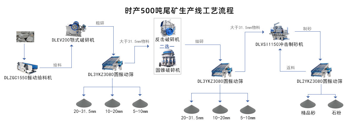 破碎:可使用顎式破碎機(jī)進(jìn)行尾礦的粗碎作業(yè),處理后的石料進(jìn)行細(xì)碎處理,硬料可使用圓錐破加工,軟料使用反擊破,保證出料再40mm以下。