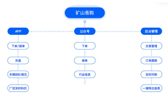 中譽(yù)鼎力礦山易購(gòu)APP平臺(tái)主要由三部分組成,分別是APP、公眾號(hào)、后臺(tái)管理組成。且分別有一下不同功能。